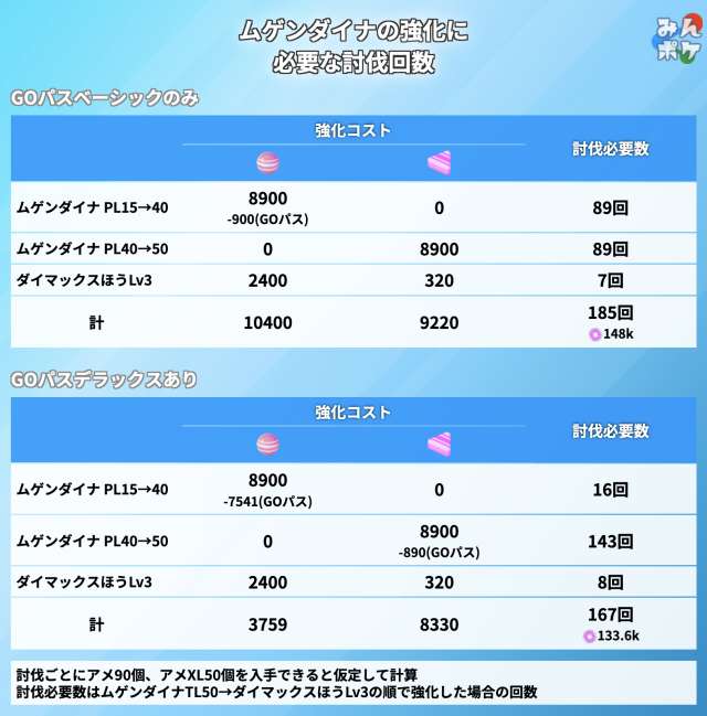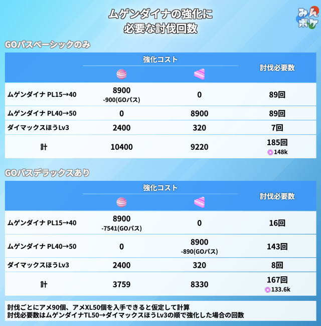 予想値のため、アメ・アメXLがタイムチャレンジでもらえたり、討伐ごとにより沢山もらえた場合は、討伐必要数は記載の回数よりも減る可能性があります。
