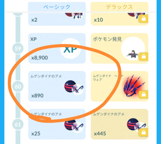 アナハイムのタイムチャレンジでムゲンダイナを入手した場合、GOパスのランク60は、「ムゲンダイナとの遭遇」から「ムゲンダイナのアメ890個」に変わるようです。