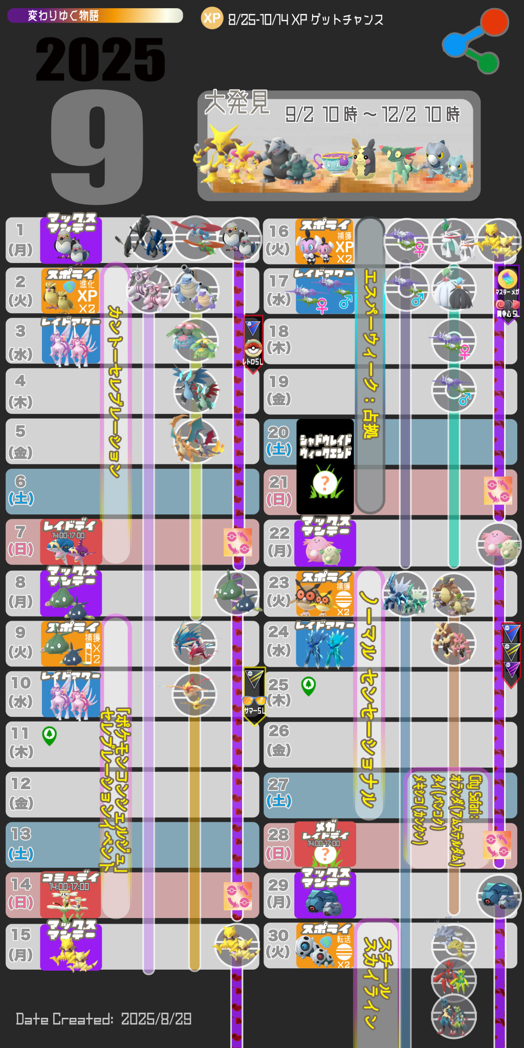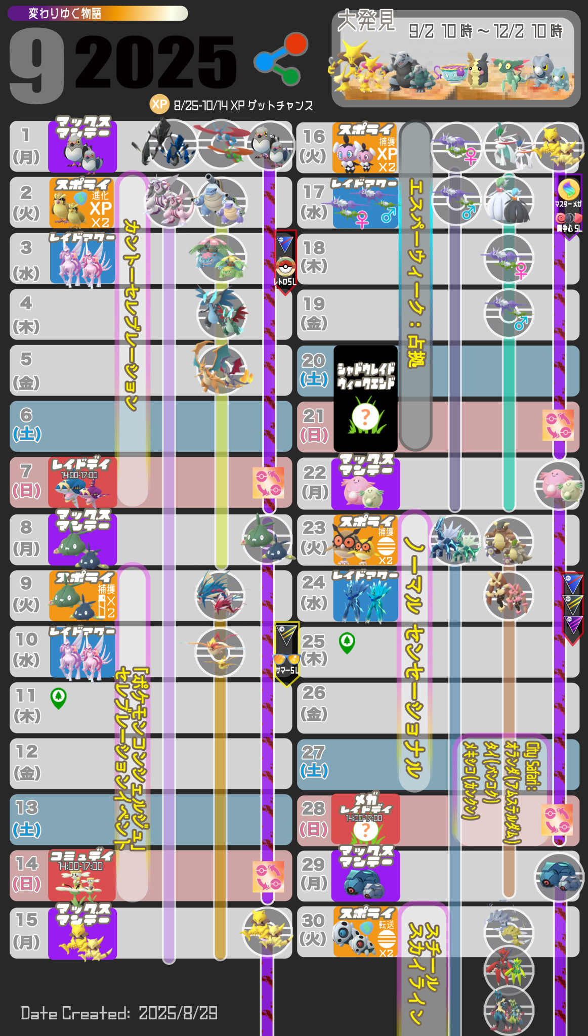 2025年9月のポケモンGOのイベント情報を掲載しています。大発見はシーズンページに移動しました。