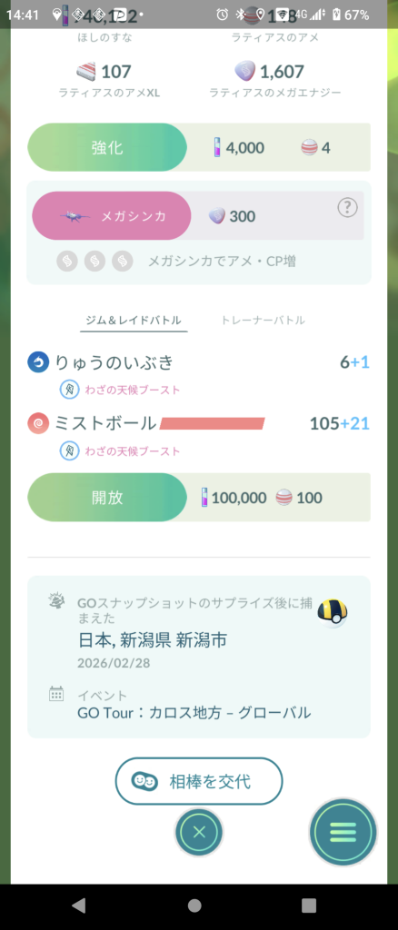 ![]() 色違い率 | ![]() スペシャルリサーチ メガシンカに関するタスク | ![]() ![]() x1GOスナップショット 2/28(土)ラティアス | ![]() ![]() x1GOスナップショット 3/1(土)ラティオス |