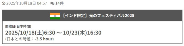 ![]() | 【インド限定】光のフェスティバル2024 12/2 15:45 |