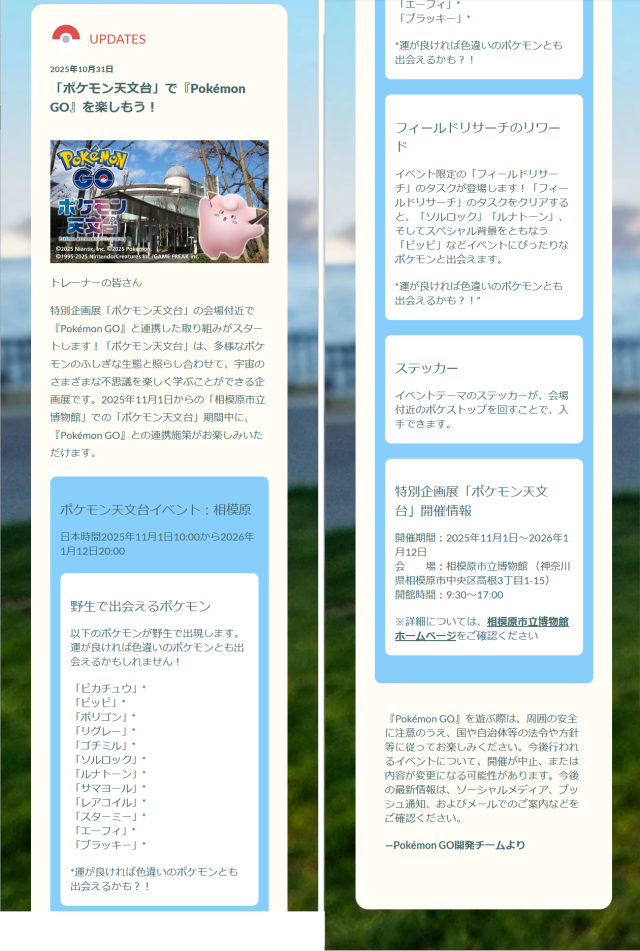 特別企画展「ポケモン天文台」の会場付近で『Pokémon GO』と連携した取り組みがスタートします! 「ポケモン天文台」は、多様なポケモンのふしぎな生態と照らし合わせて、宇宙のさまざまな不思議を楽しく学ぶことができる企画展です。2025年11月1日からの「相模原市立博物館」での「ポケモン天文台」期間中に、 「Pokémon GO』との連携施策がお楽しみいただけます。