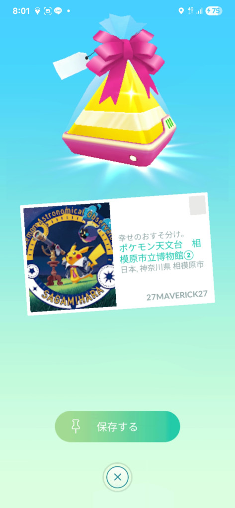 ![]() | ピカチュウ・コスモッグ 会場のポケストップを回す |