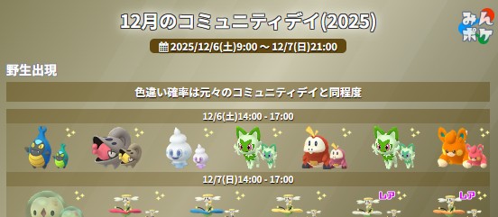 | 開催日(日本時間) 2025/12/6(土)9:00 〜 12/7(日)21:00 2025/12/6(土)9:00-21:00 2025/12/7(日)9:00-21:00 ※色違い率アップは14:00-17:00のみ |