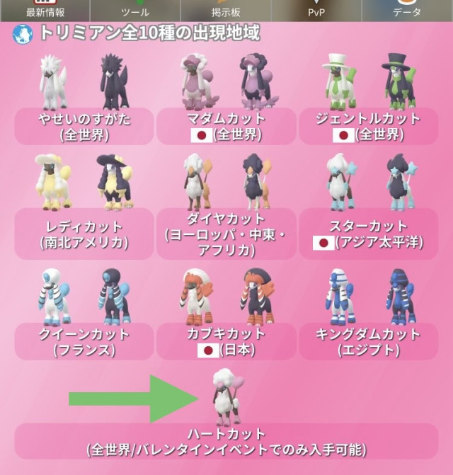 | 「やせいのすがた」のみ野生で出現。それ以外は指定された地域へ行き「すがたを変える」でカットを行うことで入手できる。 トリミアンは2021年のファッションウィークで初登場。 色違いのトリミアンは2022年のファッションウィークで初登場。 |