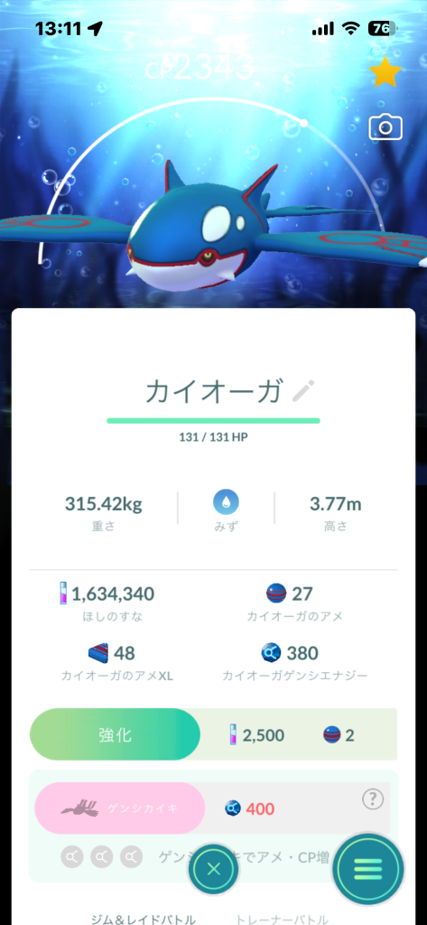 グラードンは一発で背景付きだったのにカイオーガは8戦で0