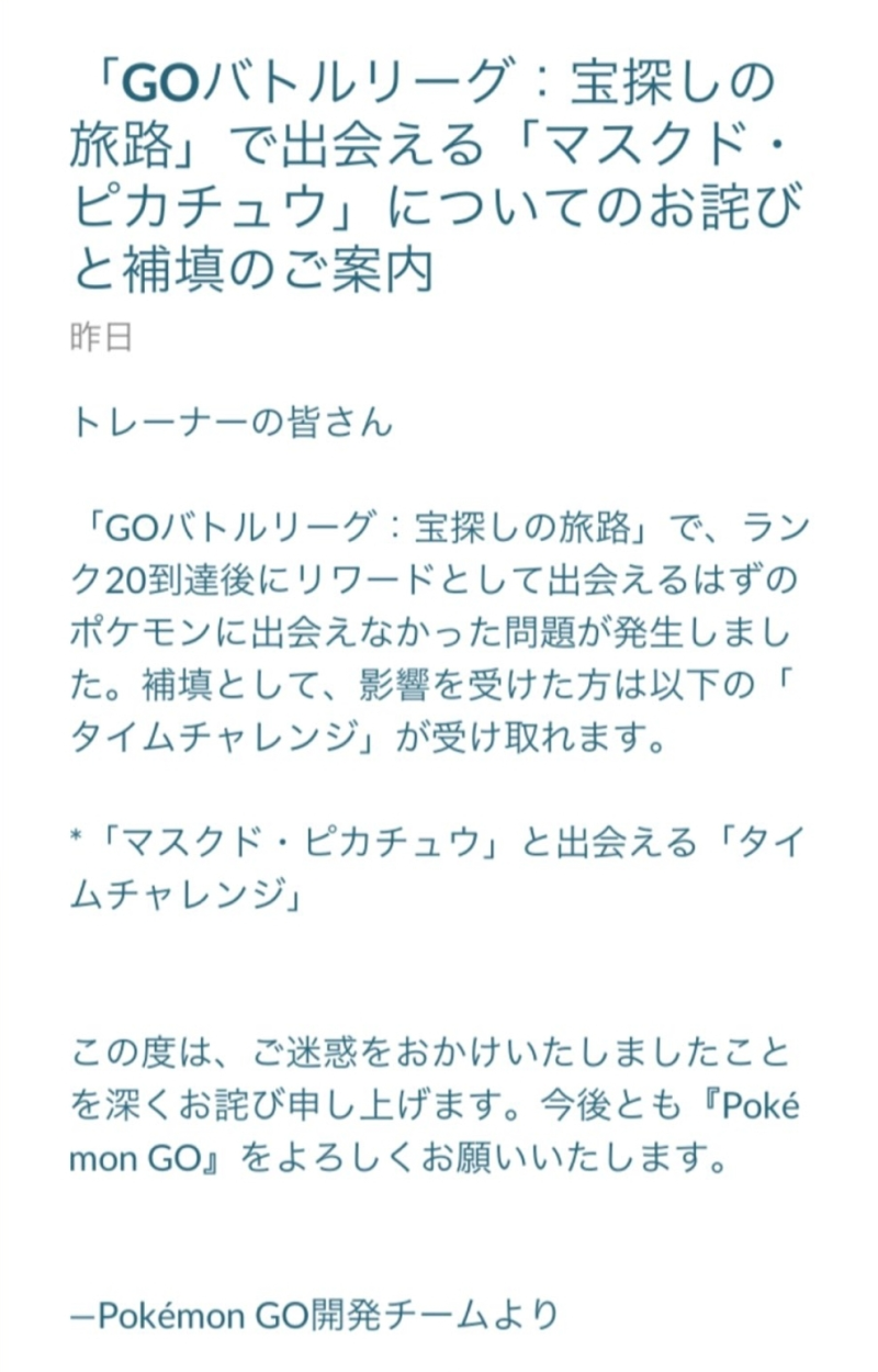 影響を受けたトレーナーにマスクド・ピカチュウと出会えるタイムチャレンジが配布されています。