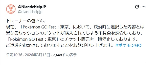 決済時に選択した内容とは異なるセッションのチケットが購入されてしまう不具合が発生しており、チケット販売が一時停止に。