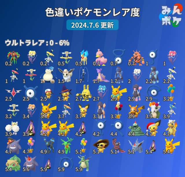 ただし色違いが実装されてからの日数が重要で当然日数が経てば捕獲者が増えてレア度は下がっていきますので実装が新しいものは割り引いてみる必要があります。