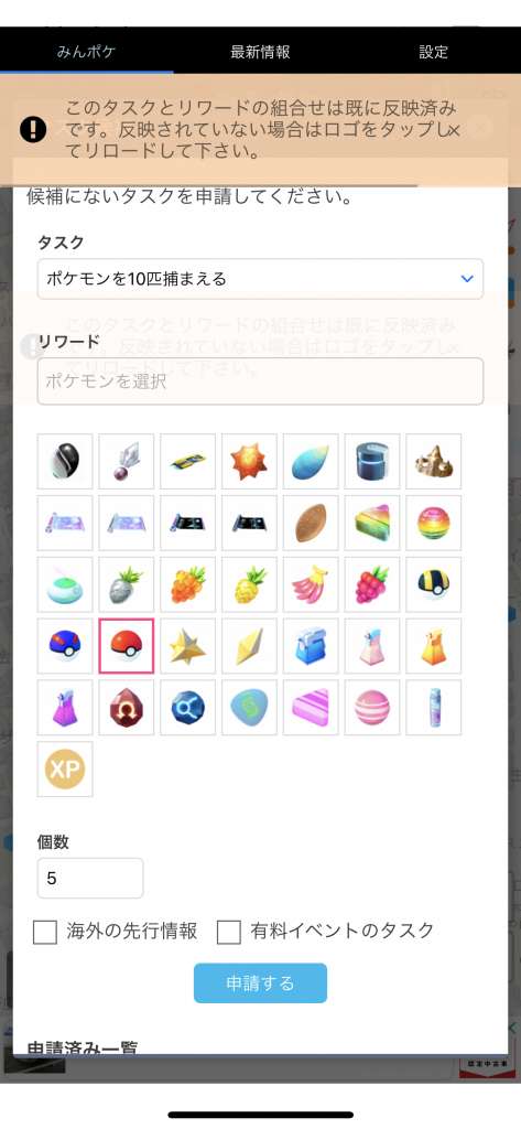 3月はホエルコがもらえたので、報酬ポケモンをホエルコで申請しました。このタスクを持ち歩く予定は無いので、本当は報酬ポケモン不明なままです