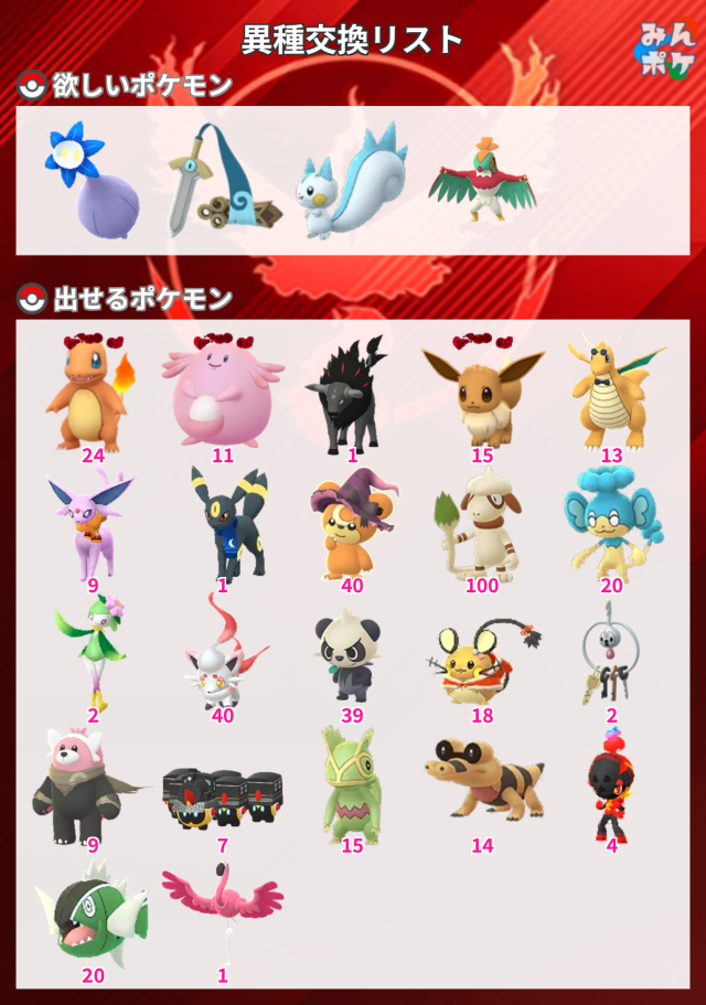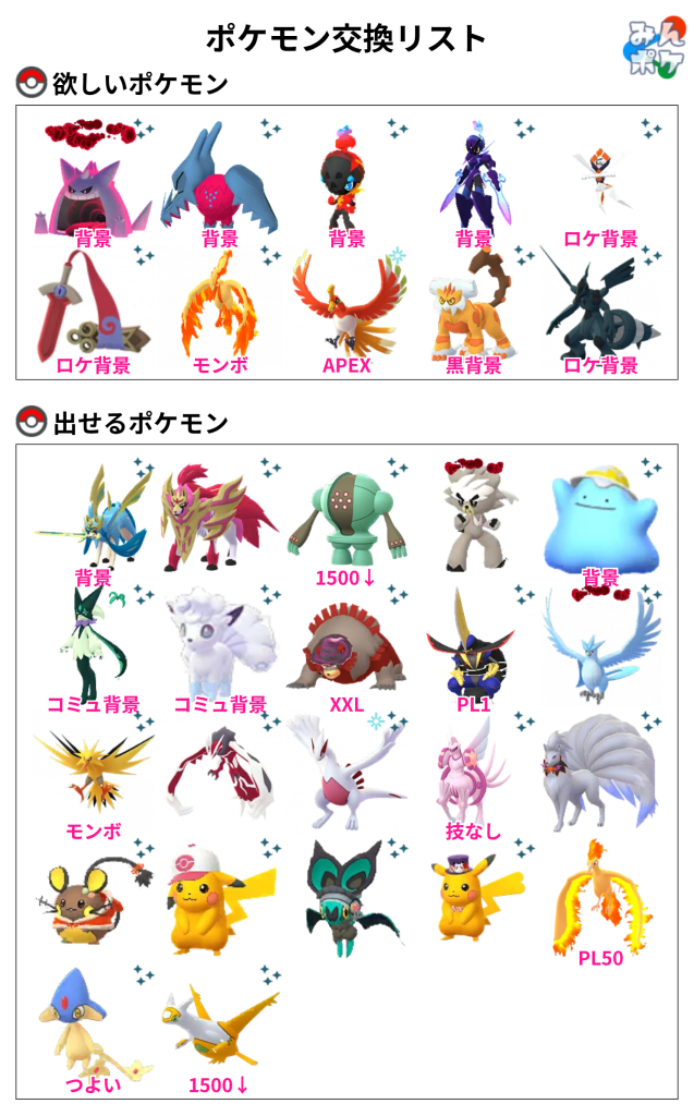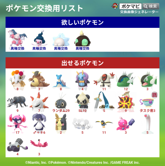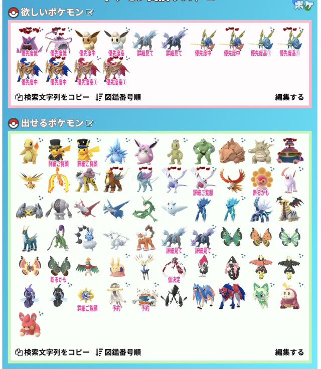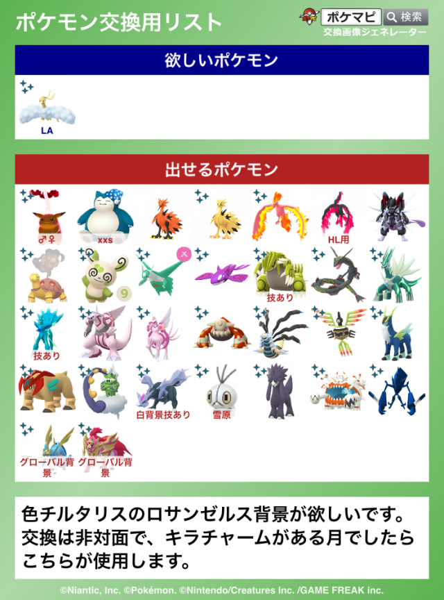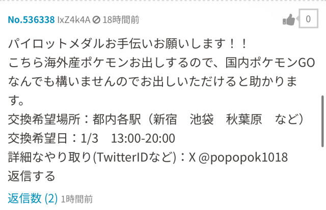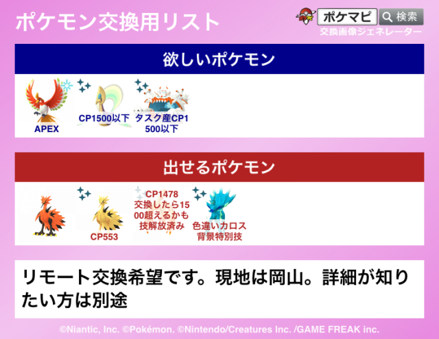 交換対象はポケモン同士のみとし、金銭やプロモーションコードなどポケモン以外の物やサービスを含めることを禁止します。投稿内容に都道府県を含めることで地域検索にヒットしやすくなります。