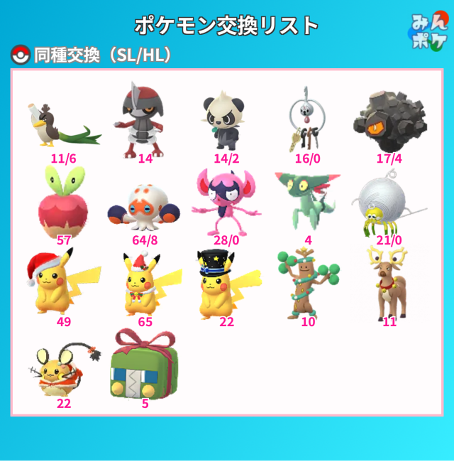 (求):カラカラ4、Dイーブイ19、ケーキ帽子イーブイ10、Dオムナイト3、ワニノコ23、バルキー3、Dタマザラシ4、Dダンバル2、ペラップ21、ドッコラー2、キバゴ3、フラベベ橙13青18白13、メェークル3、クレッフィ19、ジャラコ2、タタッコ61、モルペコ30
