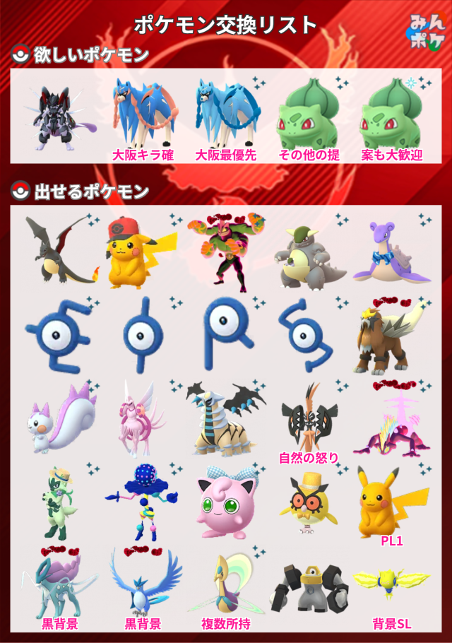 交換対象はポケモン同士のみとし、金銭やプロモーションコードなどポケモン以外の物やサービスを含めることを禁止します。投稿内容に都道府県を含めることで地域検索にヒットしやすくなります。