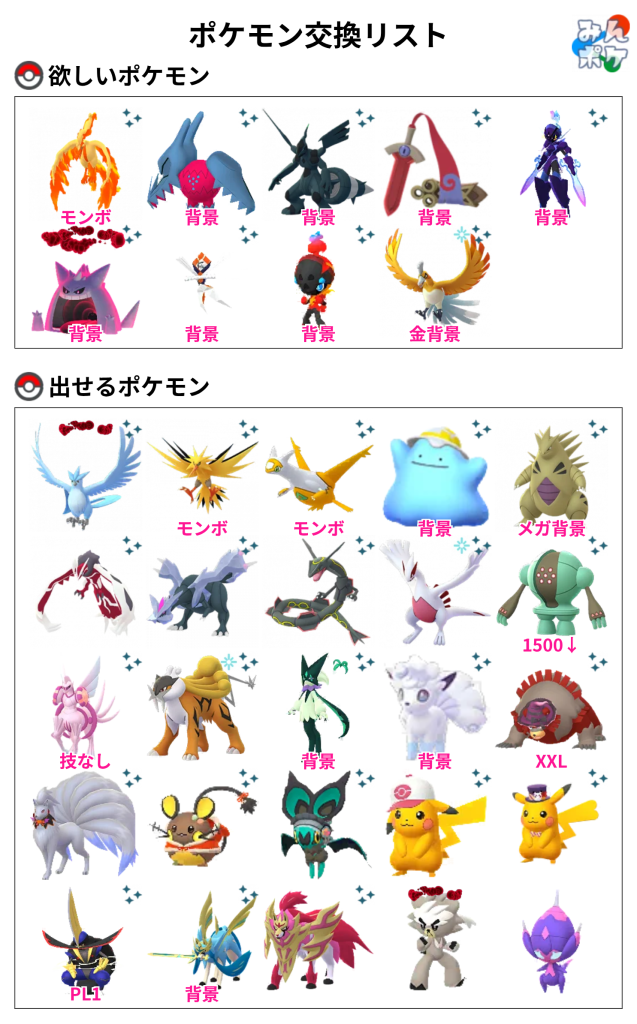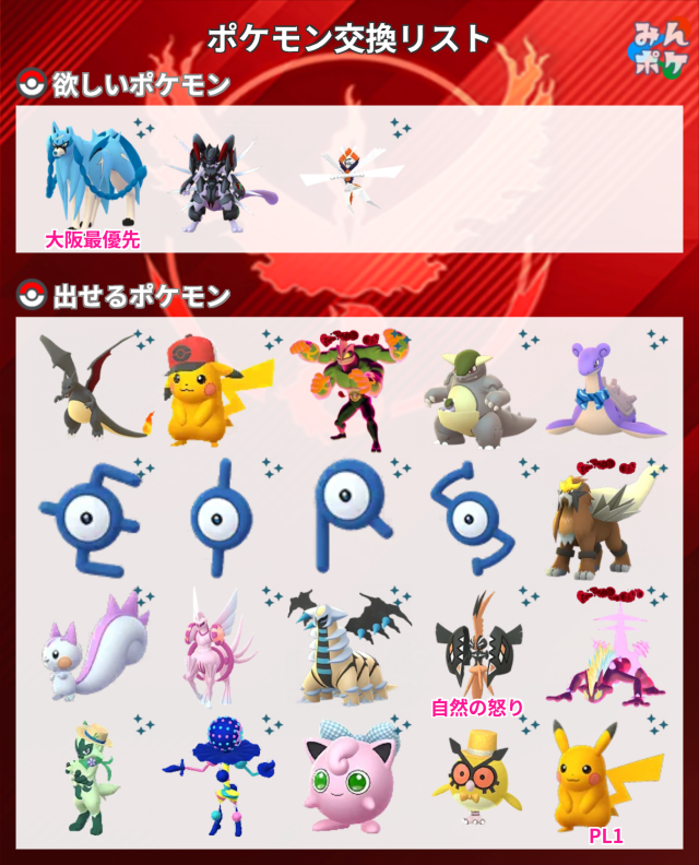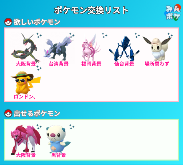交換対象はポケモン同士のみとし、金銭やプロモーションコードなどポケモン以外の物やサービスを含めることを禁止します。投稿内容に都道府県を含めることで地域検索にヒットしやすくなります。