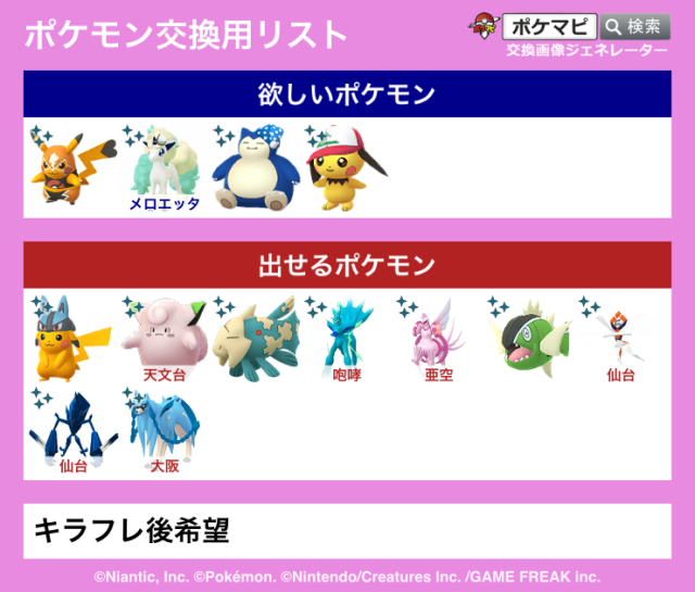 交換対象はポケモン同士のみとし、金銭やプロモーションコードなどポケモン以外の物やサービスを含めることを禁止します。投稿内容に都道府県を含めることで地域検索にヒットしやすくなります。
