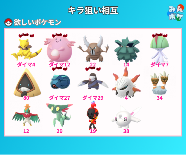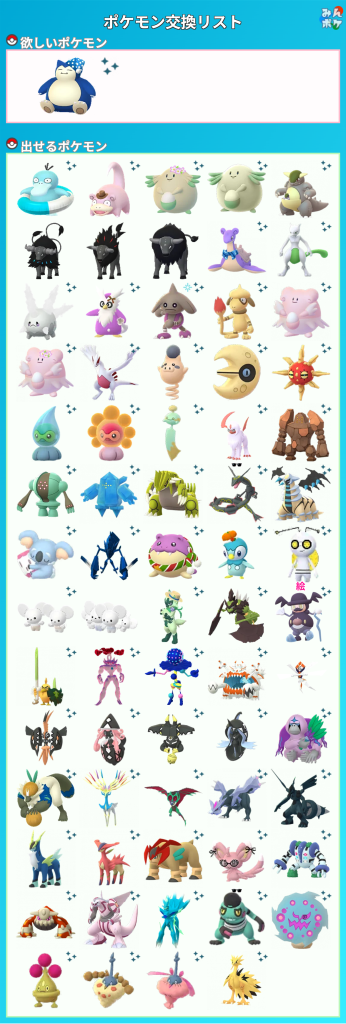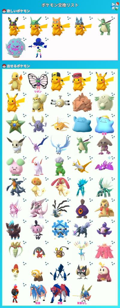詳細なやり取り(TwitterIDなど):相互交換もしくはこちらの「欲しいポケモン」リストにあるポケモンと、「出せるポケモン」リストの中のポケモンとの交換をお願いします。特別な交換は、特別なポケモン同士の交換でお願いします。「欲しいポケモン」リストに載っているポケモンはキラポケモン狙いのため、キラポケモンが出た場合は、次のポケモンとの交換に進めると嬉しいです。Campfireでのやり取りも可能です。OKならここに返信お願いします。