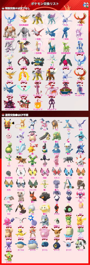 PL15以下のサンダー、スイクン、ライコウ、ラティオス、ラティアス、レジロック、ホウオウ同士も交換可能