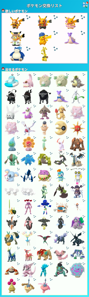 (求):歴代主人公帽子ピカチュウごちゃ混ぜ34(主人公帽子ピカチュウであればどの子とでも交換可)、ベロリンガ1、Gマタドガス1、ラプラス1、マリル33、スコルピ15、ヤヤコマ2、メレシー10、ヤクデ11