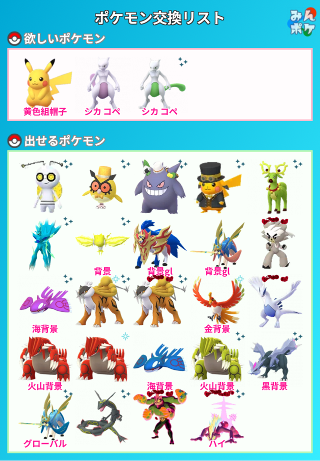 ゴーフェスシカゴ、コペンハーゲンに参加される方で、黄色チーム帽子のピカチュウと、背景付きのミュウツーを交換してくださる方はいらっしゃいますか。