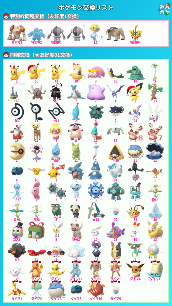 サンタピカチュウ56、ホリデーピカチュウ43、ホリデーコダック30、Gヤドン3、Gカモネギ16