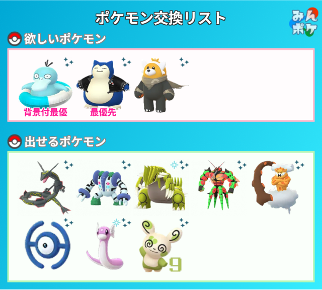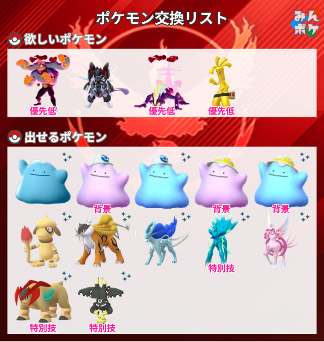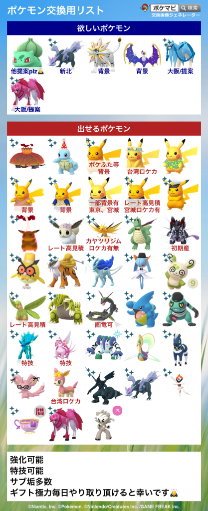交換対象はポケモン同士のみとし、金銭やプロモーションコードなどポケモン以外の物やサービスを含めることを禁止します。投稿内容に都道府県を含めることで地域検索にヒットしやすくなります。