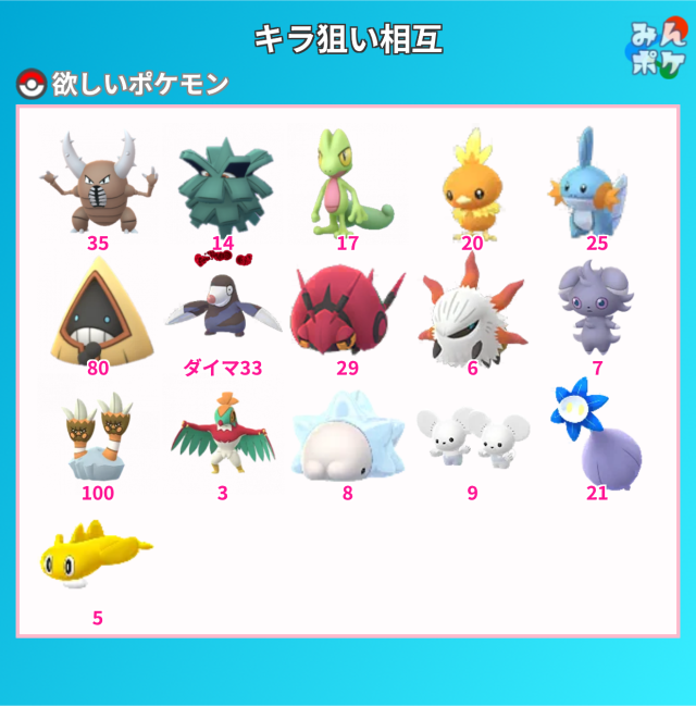 詳細なやり取り(TwitterIDなど):急募です。GOフェス時に交換できると嬉しいです。色大阪ザマゼンタ特に探しています。
