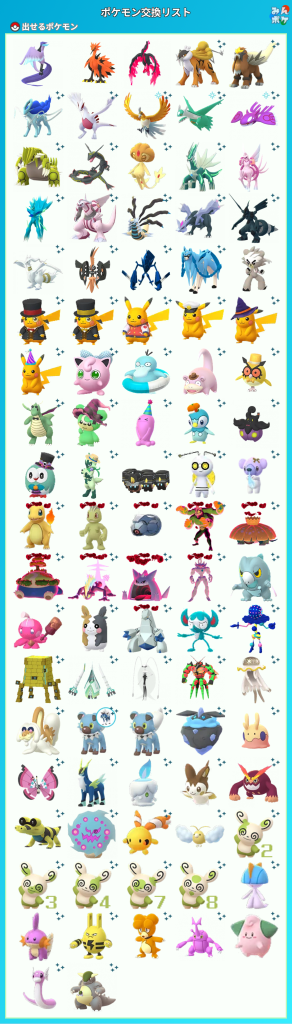 タタッコ×50、コジオ×50、モルペコ×95、ベロバー×56、メグロコ×60、メラルバ×16、イエッサン♂×10、イエッサン♀×16、カヌチャン×57、カルボウ×12、ナゲキ×50、ノノクラゲ×3、ミカルゲ×9、ペラップ×8、キテルグママント×20