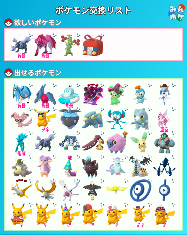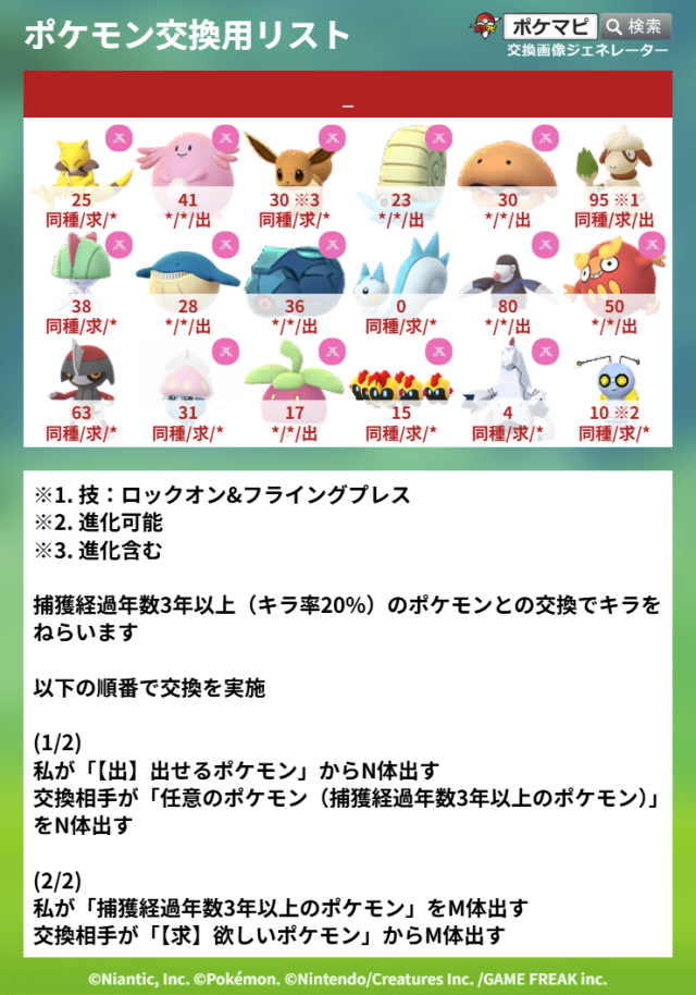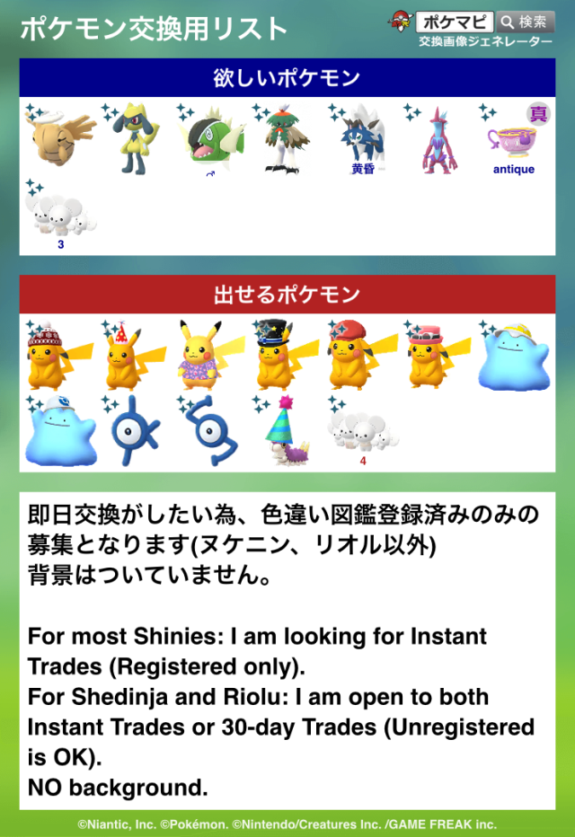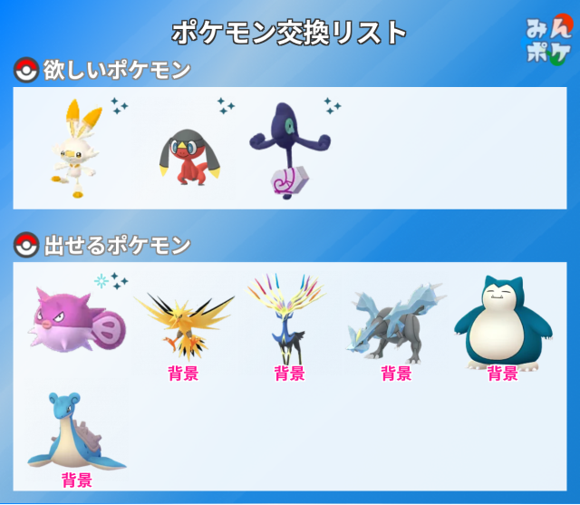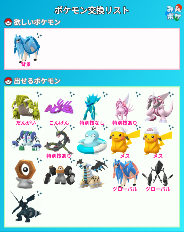 交換対象はポケモン同士のみとし、金銭やプロモーションコードなどポケモン以外の物やサービスを含めることを禁止します。投稿内容に都道府県を含めることで地域検索にヒットしやすくなります。