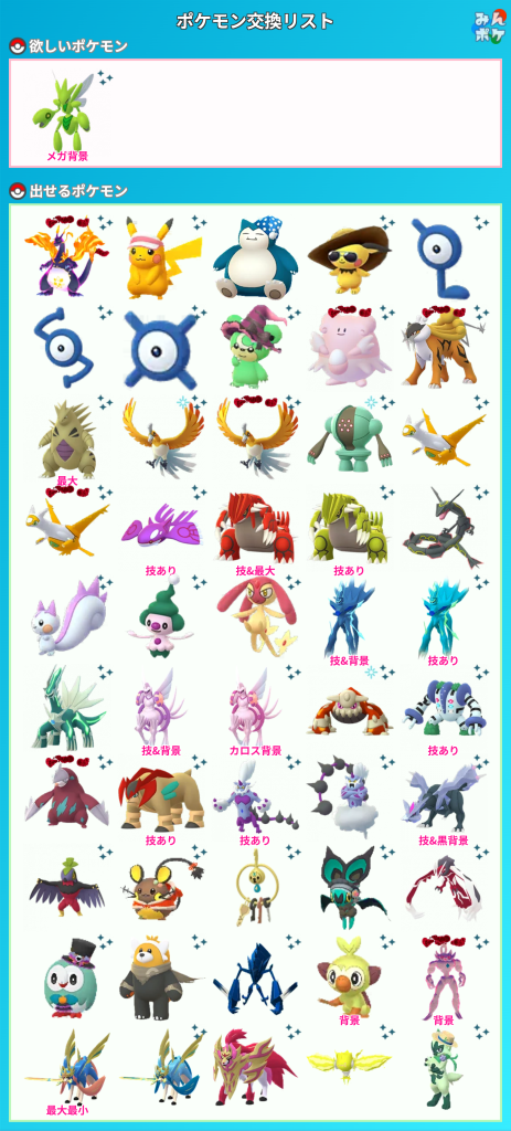 確認させていただきたいのですが、交換可能な背景持ちの色違いポケモンは3枚目の個体以外にもお持ちだったりしますでしょうか…?