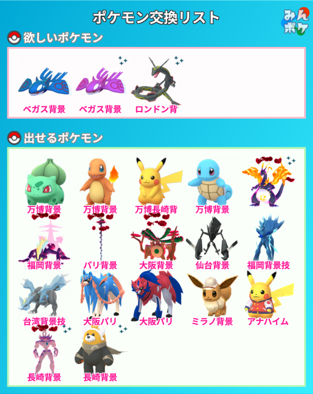 交換対象はポケモン同士のみとし、金銭やプロモーションコードなどポケモン以外の物やサービスを含めることを禁止します。投稿内容に都道府県を含めることで地域検索にヒットしやすくなります。