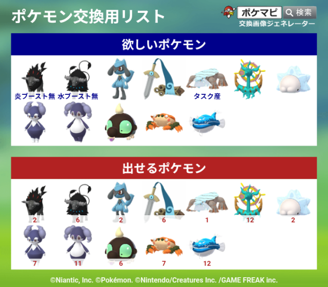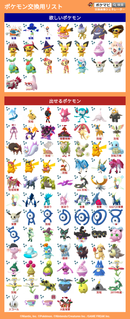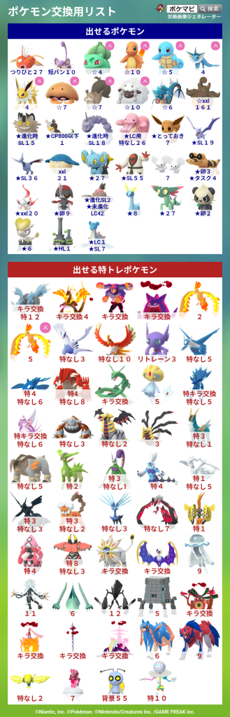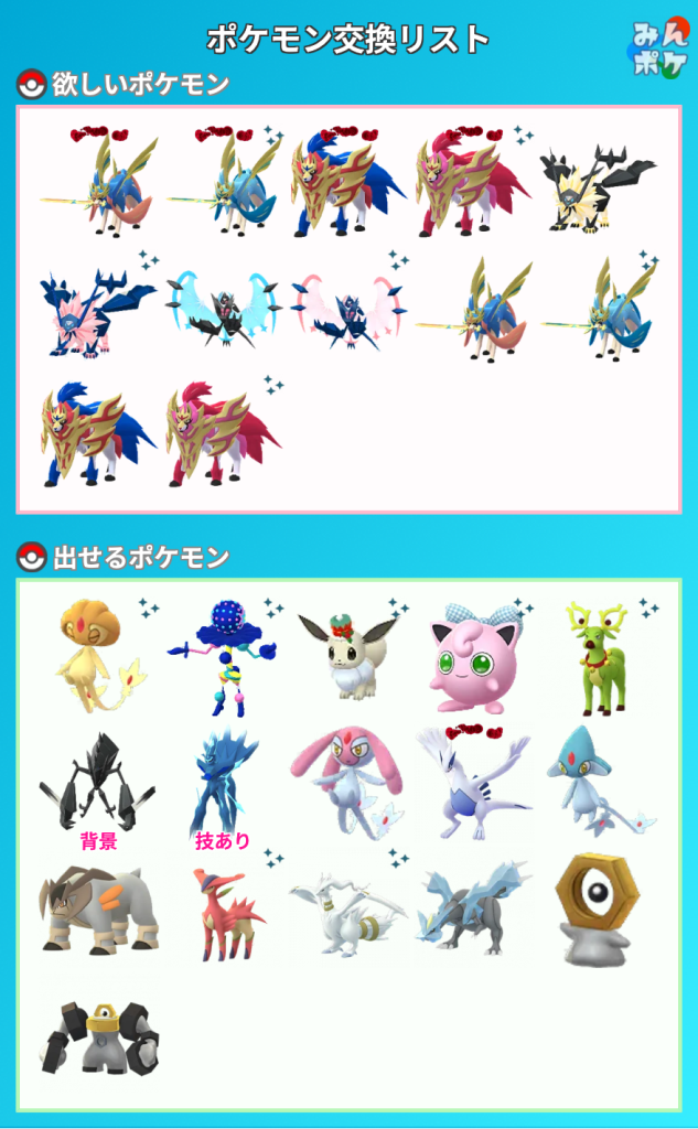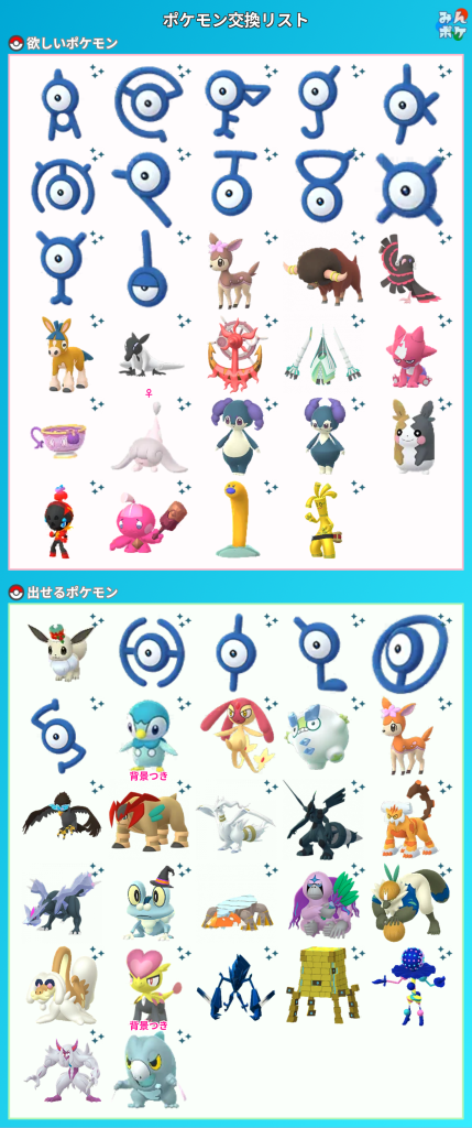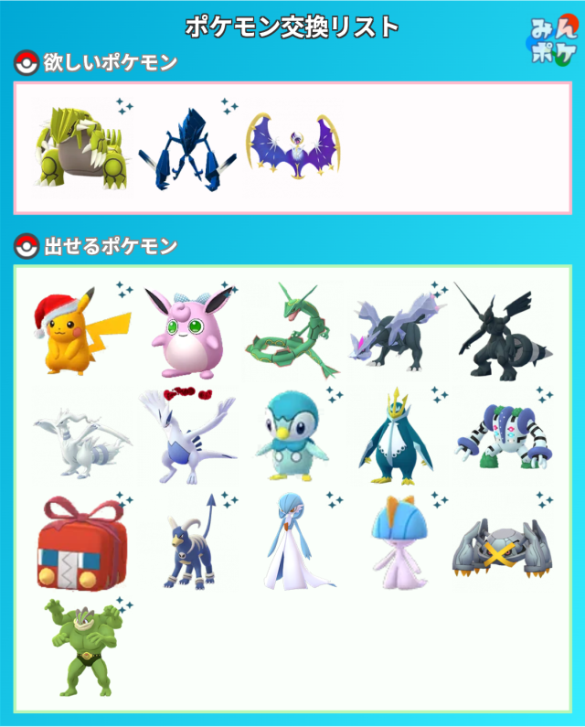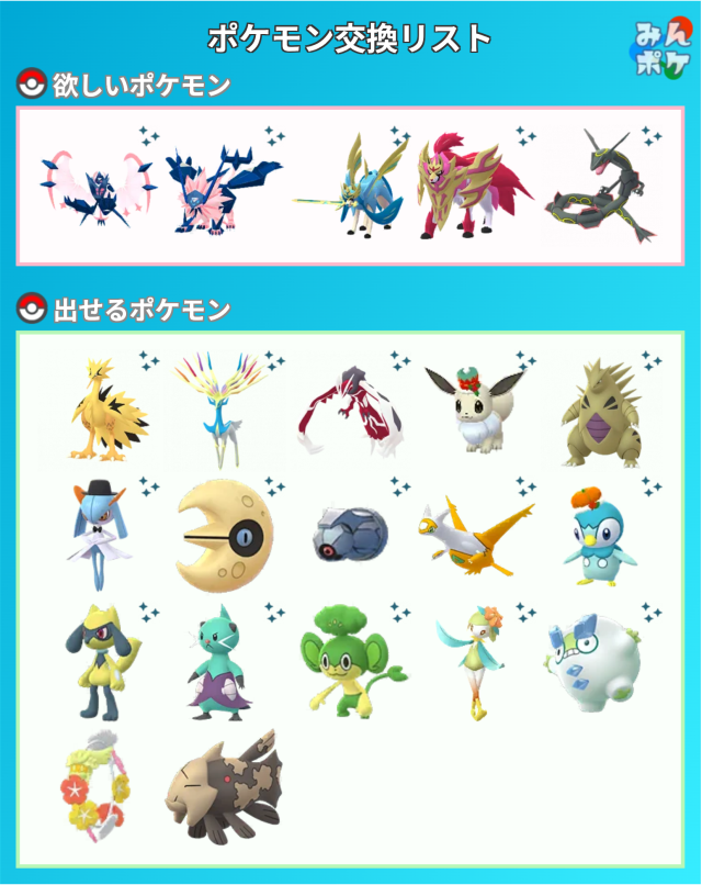 上記のポケモンをお出しいただける場合は、リストの☆ポケモン中からお好きなものを同数お出しします。