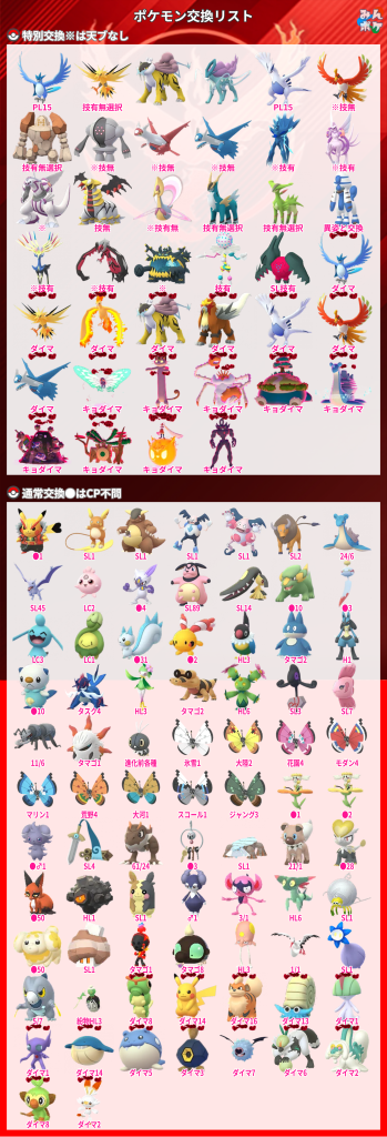 PL15以下のサンダー、スイクン、ライコウ、ラティオス、ラティアス、レジロック、ホウオウ同士も交換可能