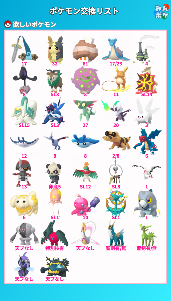 Gニャース SL62HL12、GカモネギSL9、カラナクシSL16、コマタナ12、バルチャイLC30SL31、フラベベSL赤8、ヤンチャム8、マーイーカSL23、ヌメラSL14、ワンパチSL44、パピモッチSL9HL3、コジオ(CP490以下)13、ズピカSL8HL14、ノノクラゲSL15、コレクレー(進化可)23
