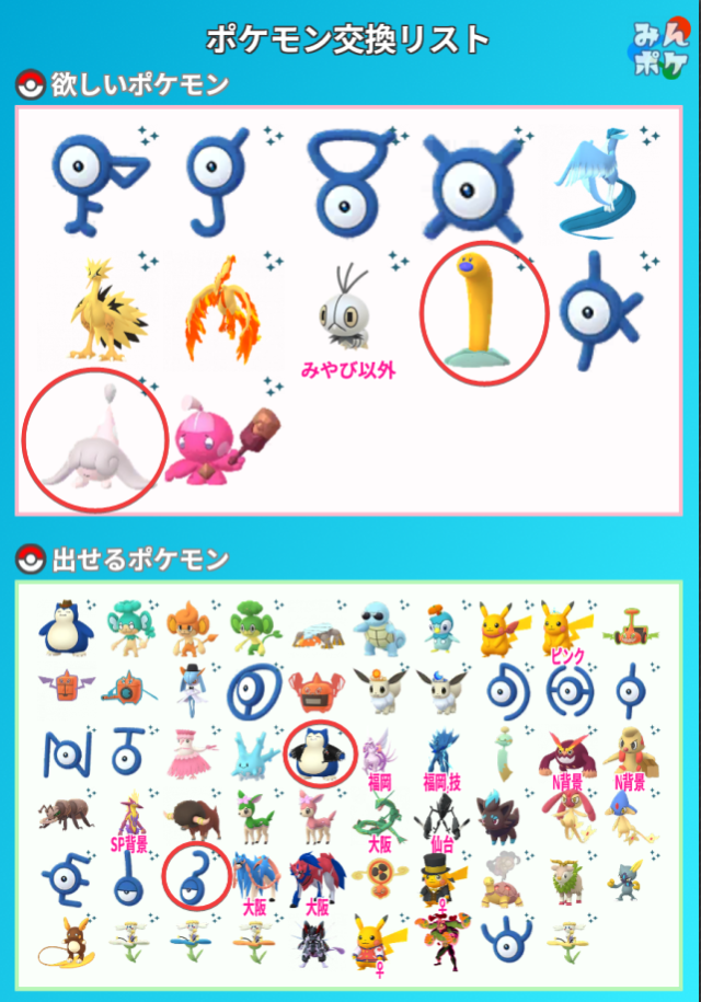 出せるポケモンと欲しいポケモンを丸で囲んでおきました。