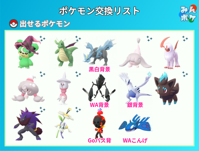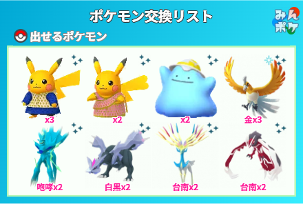ポケモン(出):ヤトウモリ♀3・カラミンゴ3・キラーメ1・ガルーラ22・バクガメス9・ヤンチャムSL19・カイデン11・クレッフィ20・オトシドリ13・ベロバー7・カクレオン10・ナゲキ11・ブロロン2・ルカリオ4・コスチュームカラカラ8・スカーフラプラス8・バスラオ(青12白3)・コフキムシ(ランダム32)・メラルバ5・イッカネズミ4・ウミディグダ5・イエッサン♀4・タスク産ヤバチャ3