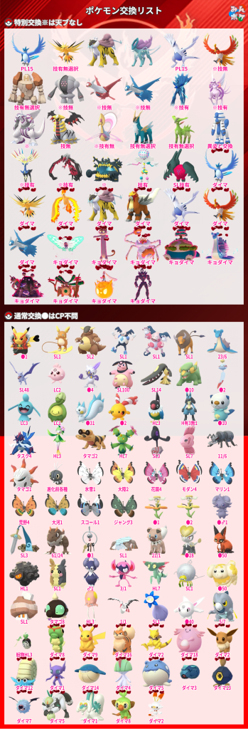 PL15以下のサンダー、スイクン、ライコウ、ラティオス、ラティアス、レジロック、ホウオウ同士も交換可能