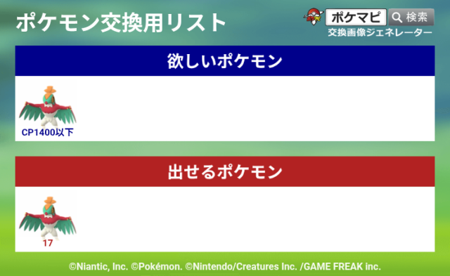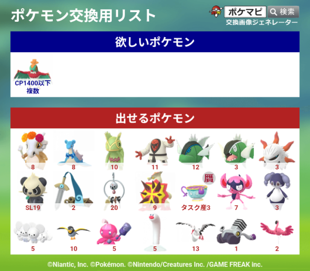 ポケモン(求):CP1400以下ルチャブル複数異種交換