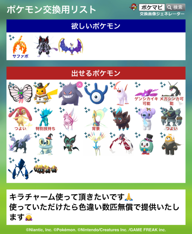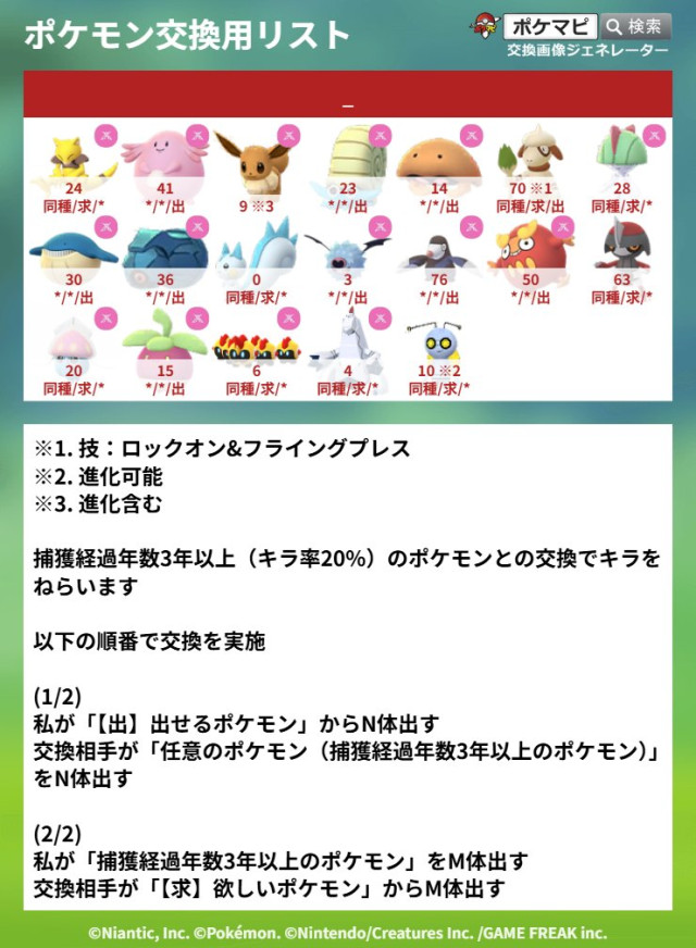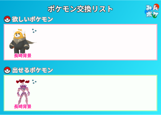 交換対象はポケモン同士のみとし、金銭やプロモーションコードなどポケモン以外の物やサービスを含めることを禁止します。投稿内容に都道府県を含めることで地域検索にヒットしやすくなります。