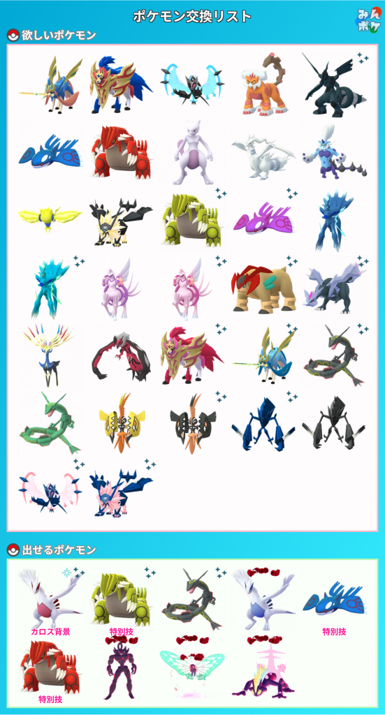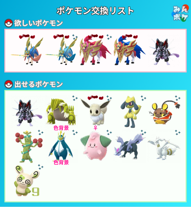 こちらの欲しいポケモンは可能であればキラ個体で入手したいので、確定キラ交換込の2回交換orキラフレ後の交換対応になる事をご了承いただければと思います