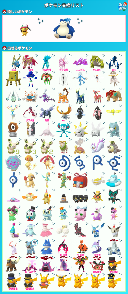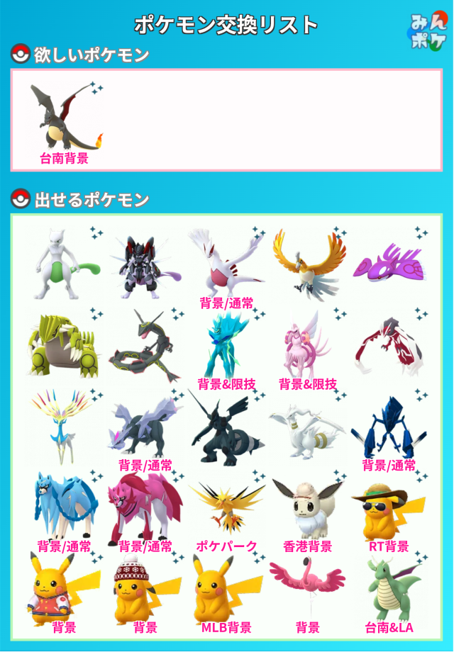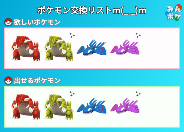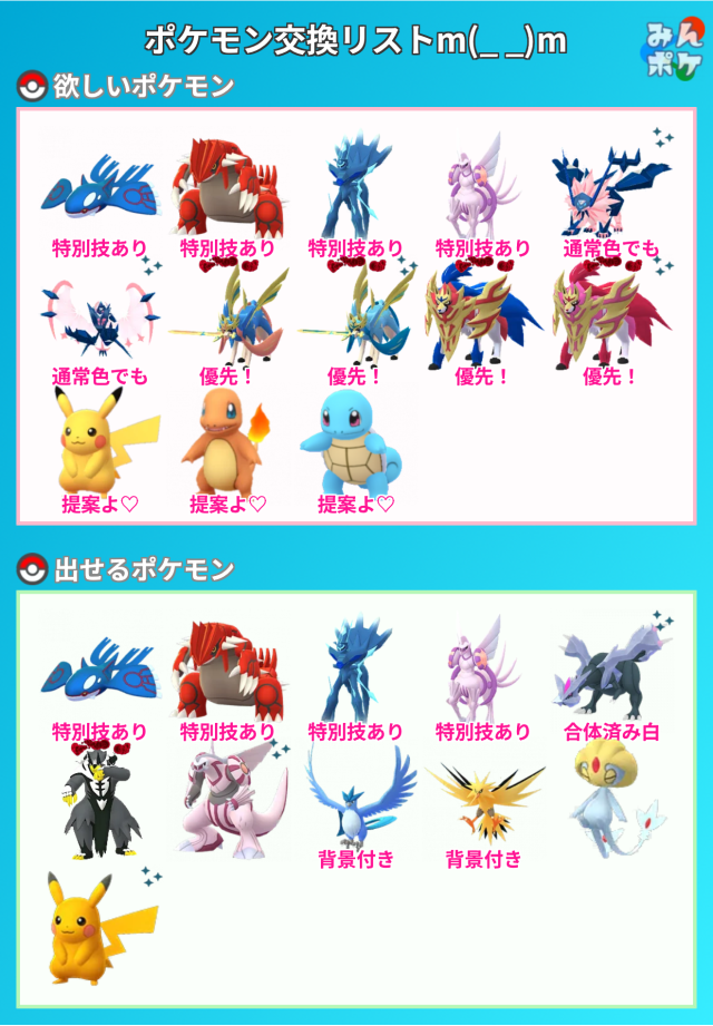 詳細なやり取り(TwitterIDなど):相互交換もしくはこちらの「欲しいポケモン」リストにあるポケモンと、「出せるポケモン」リストの中のポケモンとの交換をお願いします。特別な交換は、特別なポケモン同士の交換でお願いします。「欲しいポケモン」リストに載っているポケモンはキラポケモン狙いのため、キラポケモンが出た場合は、次のポケモンとの交換に進めると嬉しいです。Campfireでのやり取りも可能です。OKならここに返信お願いします。