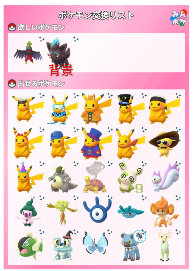 ポケモン(出):画像の「欲しいポケモンリスト」内のポケモン、または「出せるポケモン」リストのポケモン+レッド帽子ピカチュウ&リーフ帽子ピカチュウ