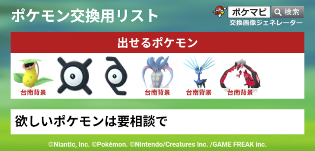 交換対象はポケモン同士のみとし、金銭やプロモーションコードなどポケモン以外の物やサービスを含めることを禁止します。投稿内容に都道府県を含めることで地域検索にヒットしやすくなります。