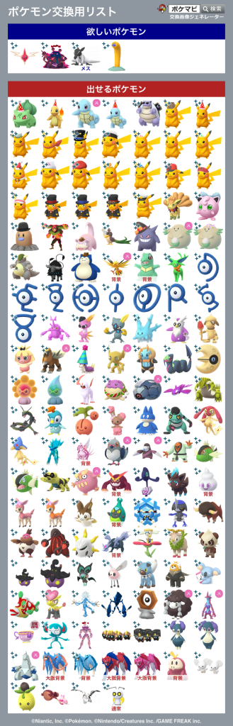 上記のポケモンをお出しいただける場合は、リストの☆ポケモンとコフキムシ(みやび)21の中からお好きなものを同数お出しします