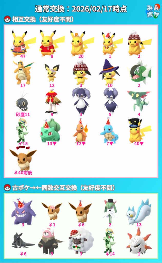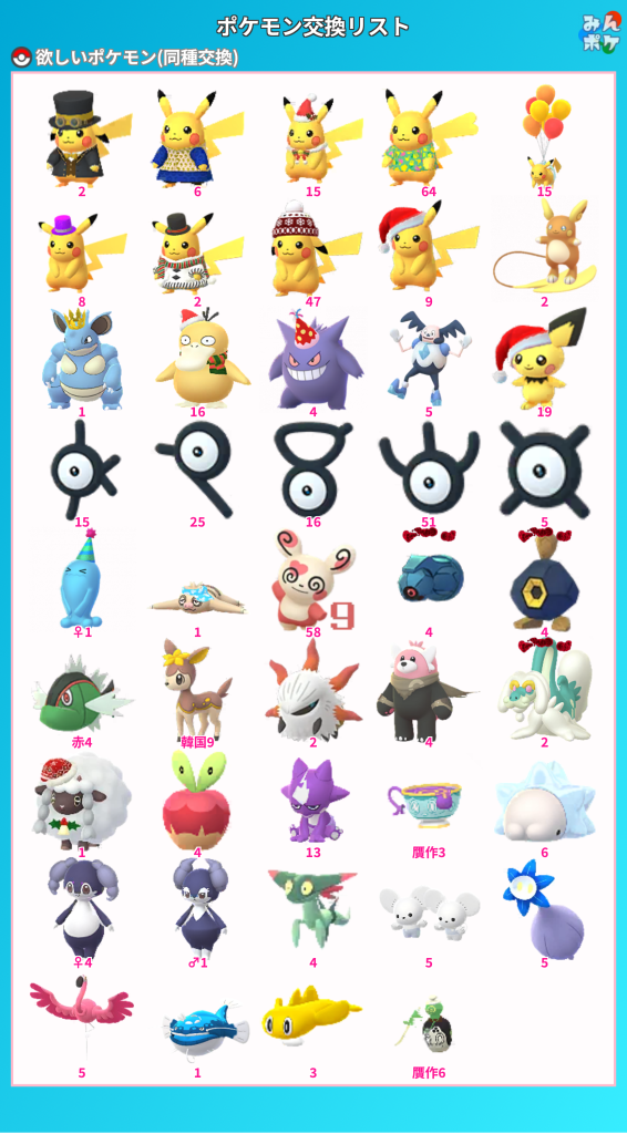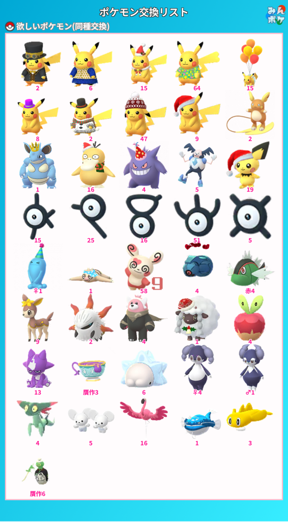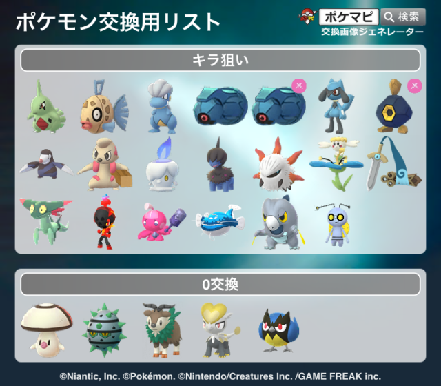旧正月イベント中に交換してキラらせたいポケモン達を並べました。