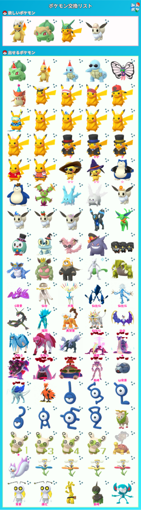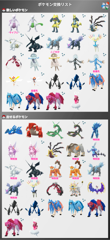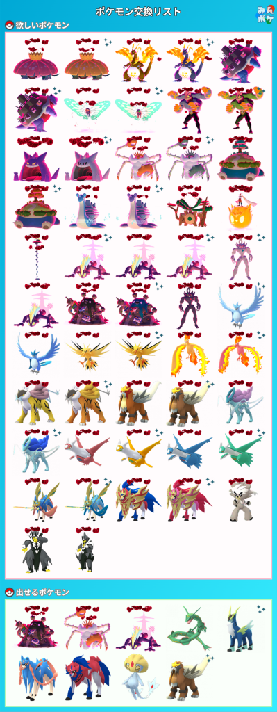 提示のポケモンはほとんど出せます。キラフレンドの際に定期的に交換希望です。