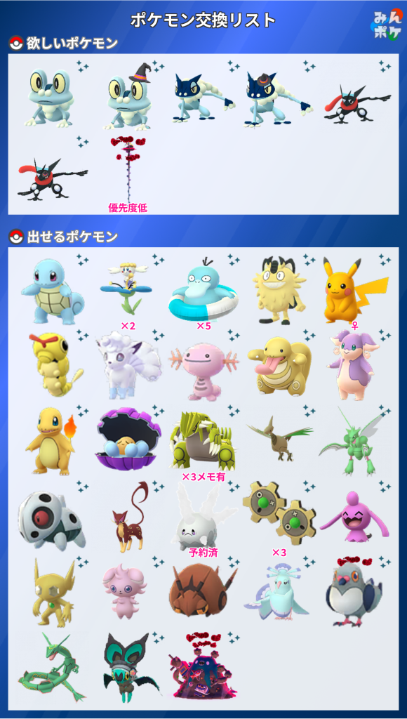 上記のポケモンをお出しいただける場合は、リストの☆ポケモンとコフキムシ(みやび)15の中からお好きなものを同数お出しします