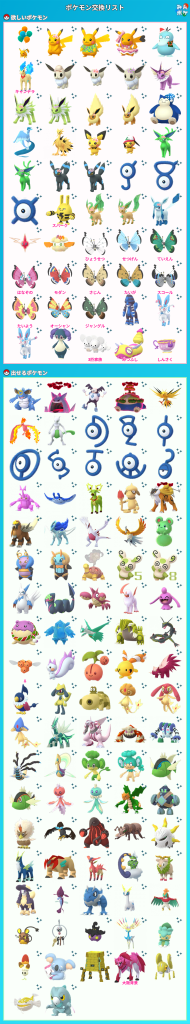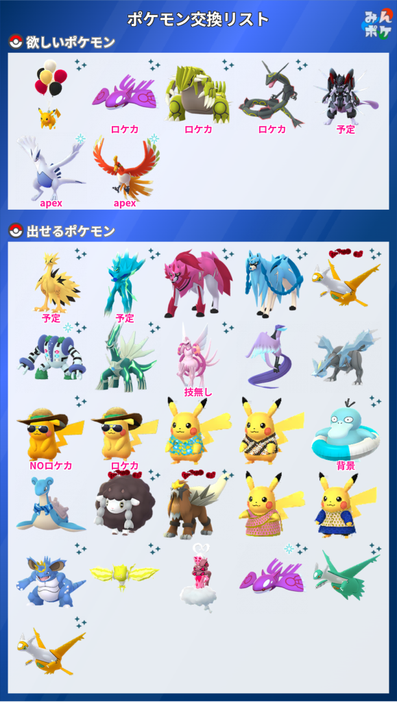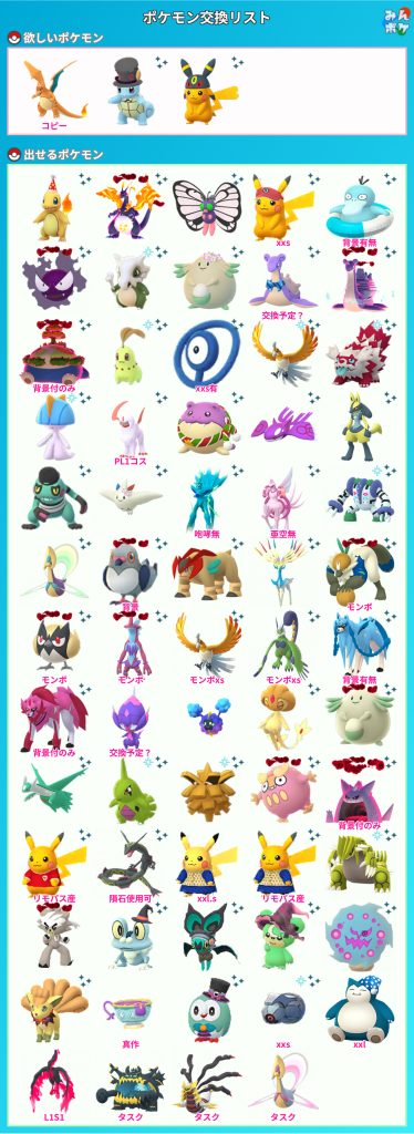 上記のポケモンをお出しいただける場合は、リストの☆ポケモンとコフキムシ(みやび)17の中からお好きなものを同数お出しします