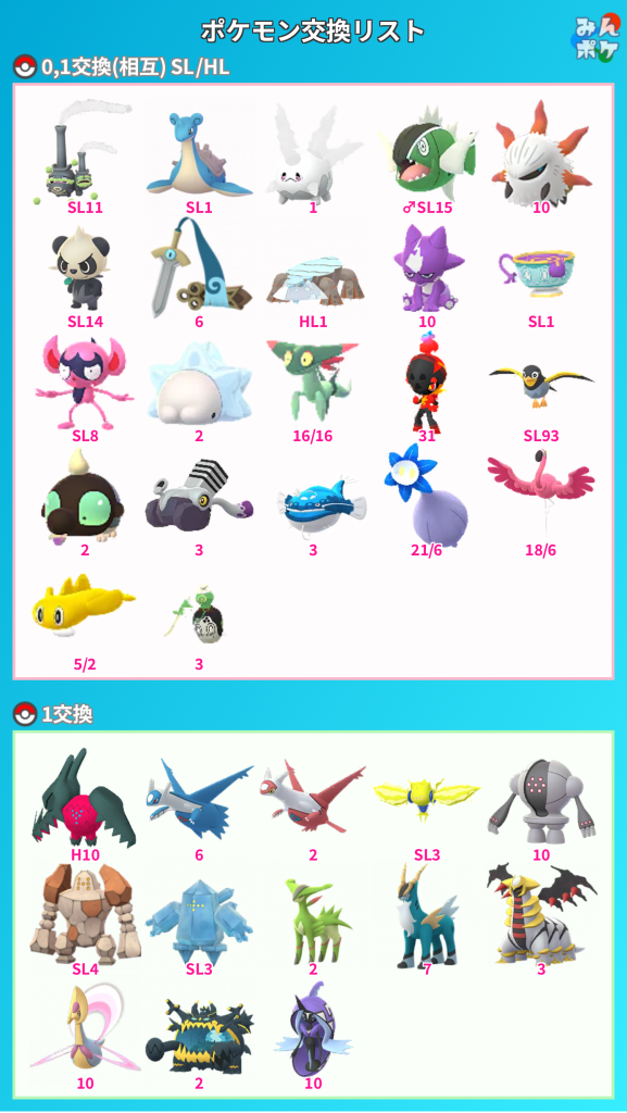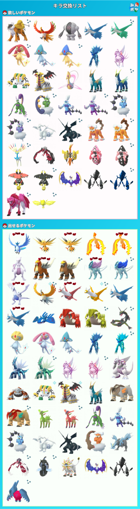 1交換:ガラルファイヤーHL1、レジロックHL6、レジアイスHL5、ユクシー4、ディアルガオリジン時の咆哮10、パルキアオリジン亜空切断5、ギラティナアナザー色違い1オリジン6色違い1、クレセリアSL草結び有2無2、コバルオン聖剣有2、ビリジオン聖剣有3無2、キュレム凍える世界9、カプ・コケコ自然の怒り5、カプ・テテフ自然の怒り2、カプ・ブルル自然の怒り8、マッシブーン16、アクジキングPL20-10、ツンデツンデ15、レジドラゴPL20-1