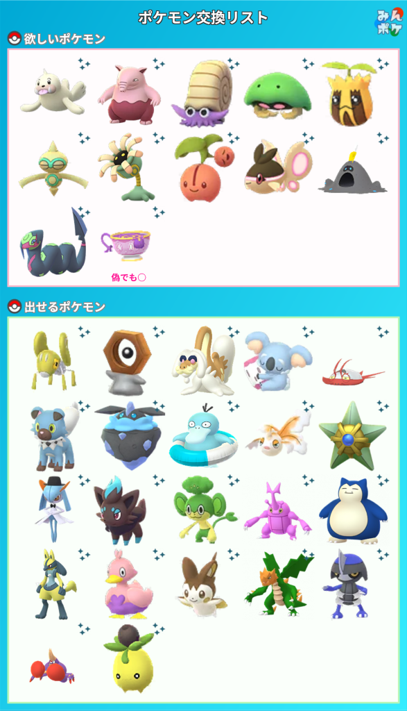 (求):Gカモネギ4、カラカラ7、Dイーブイ19、ワニノコ24、ヘラクロス♂3、バルキー3、Dタマザラシ4、ペラップ21、ゾロア19、キバゴ2、メェークル4、クレッフィ19、Dジジーロン11、タタッコ30、モルペコ30、カイデン51