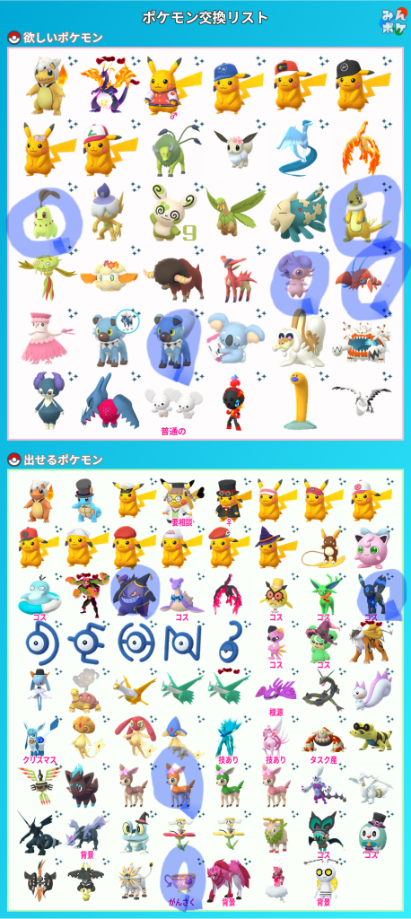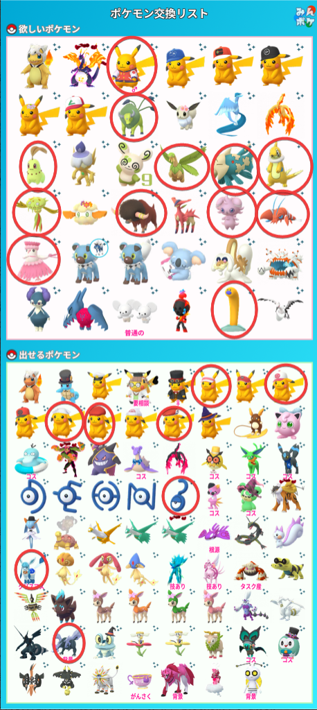 画像内で、私が所持しているポケモンと探しているポケモンを〇で囲みました。